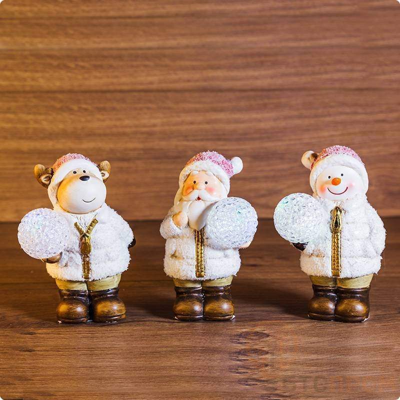 Керамическая фигурка «Дед Мороз, Снеговик и Олененок» 10×9×13 см — интересное решение для украшения интерьера во время новогодних праздников. В набор входят 3 фигурки, которые помогут создать уникальный арт-объект, став частью праздничной композиции. Персонажи в руках держат полупрозрачные шарики, подсвечиваемые диодами RGB, которые светятся разными цветами в хаотичном порядке, отбрасывая яркие блики на окружающие предметы. Фигурки с защитой IP20 предназначены для использования в сухих отапливаемых помещениях. 2 элемента питания типа LR44 идут в комплекте каждого изделия.