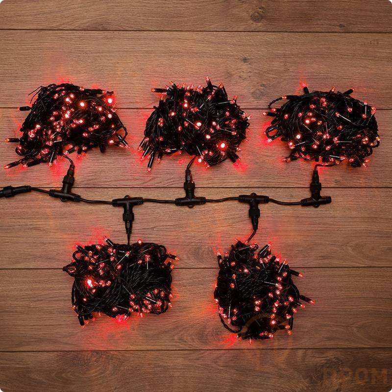 Данная гирлянда состоит из 5 нитей, представлена в красном цвете свечения светодиодов. Ее каждый 5 диод мерцает белым цветом.