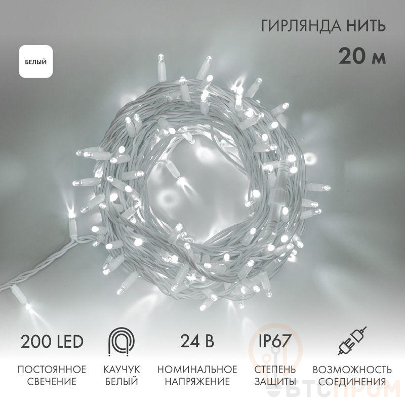 Гирлянда светодиодная "Нить" 20м 200LED бел. 15Вт 24В IP67 постоян. свечение провод каучук бел. (нужен трансформатор 531-100/531-311/531-312) Neon-Night 315-505