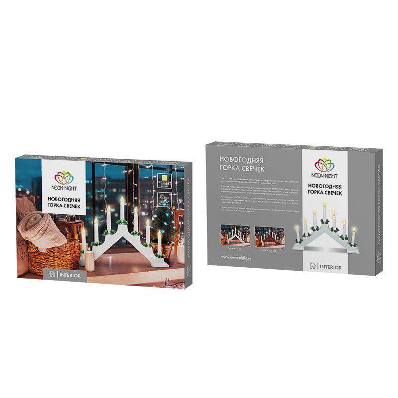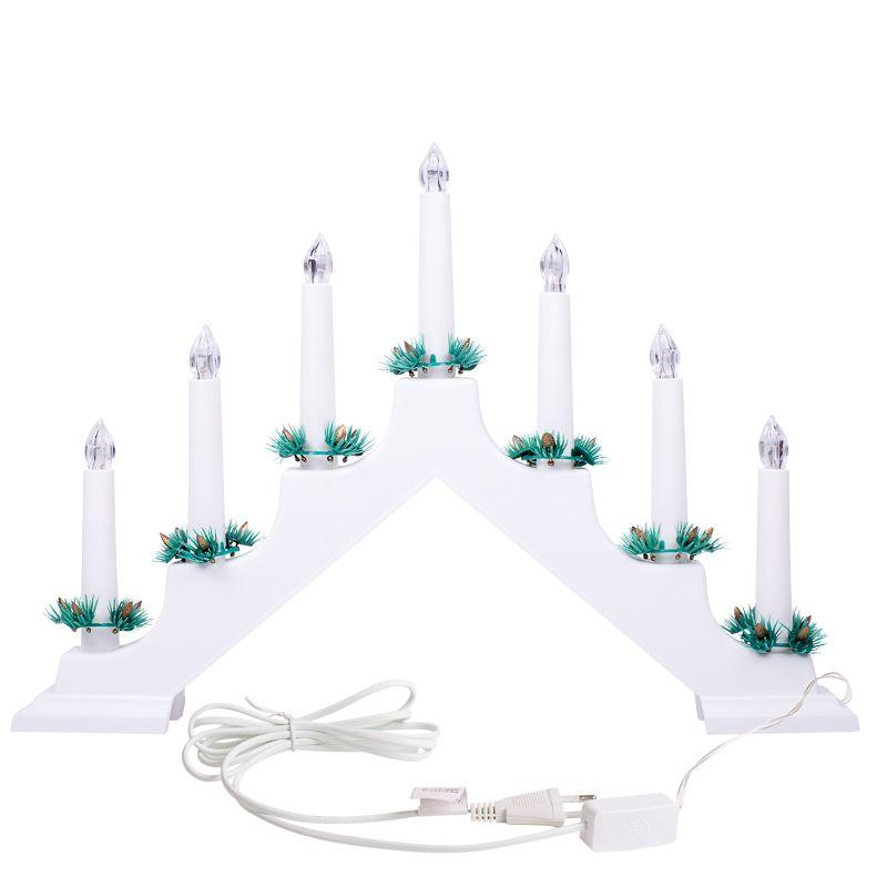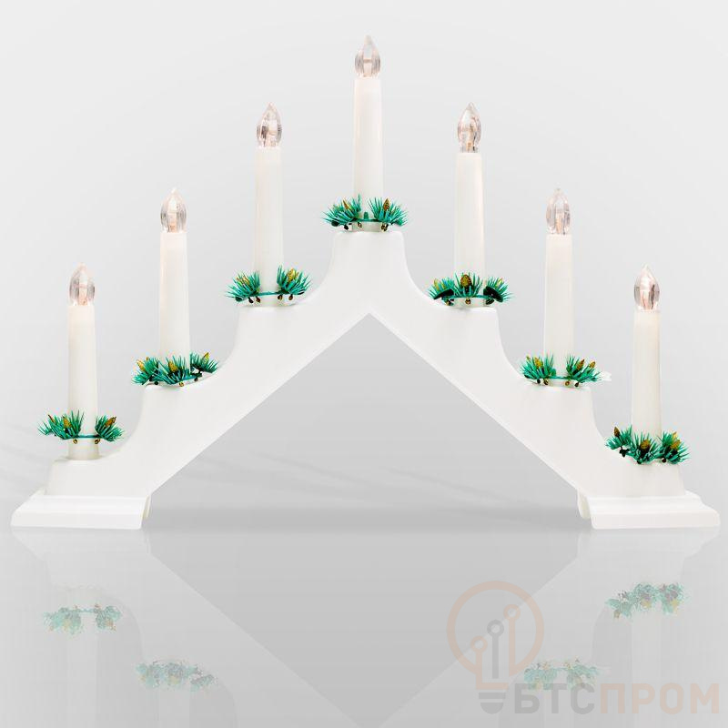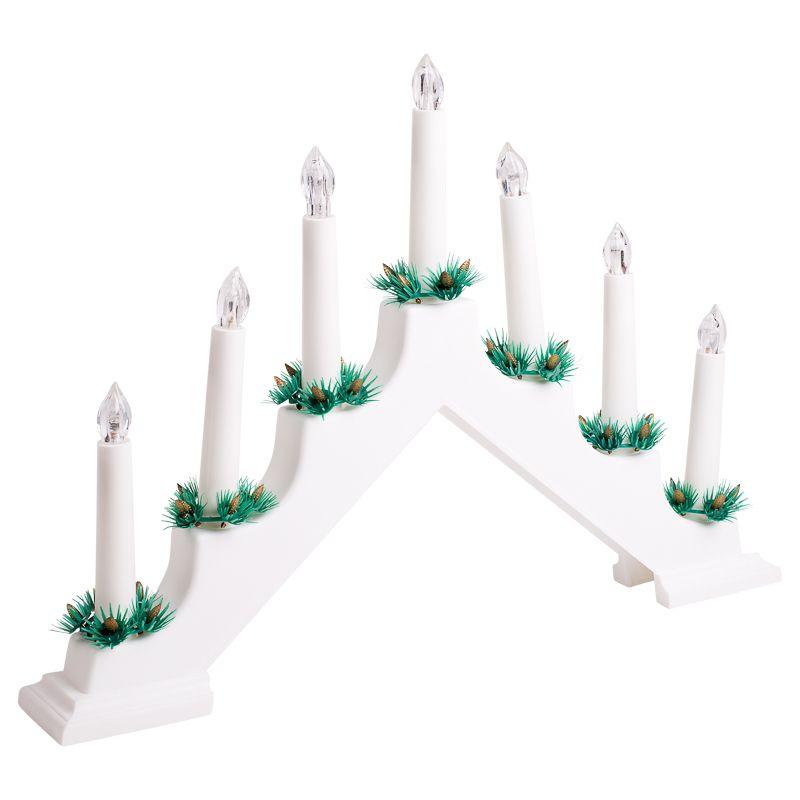 Новогодняя горка белого цвета с 7 свечками — великолепное дополнение к оформлению праздничного стола или декоративной композиции, а также отличный подарок для родных и друзей на любой из зимних праздников. Композиция состоит из 7 белых свечей, украшенных хвойными мини-венками, на Л-образной подставке. 7 экономичных ярких светодиодов излучают теплый белый свет. Для подключения к электросети предусмотрен 1,5-метровый кабель, длина которого позволяет разместить горку в любом удобном месте без использования удлинителя.