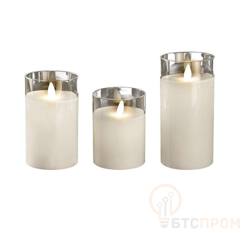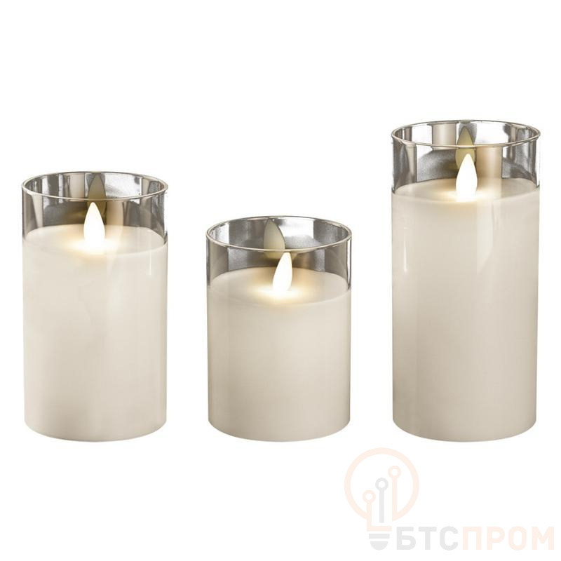 Восковые светодиодные свечи в корпусе из декоративного стекла Необыкновенный эффект «живого пламени» В комплект 3 свечи разной высоты (10см, 12.5см, 15см) Предназначены для декоративного освещения внутри помещений Создают ощущение праздника и уюта, романтической и торжественной обстановки. Пожаробезопасны. Нет открытого огня, нет риска возгорания, нет восковых следов. Очень экономичны (светодиоды с малым потреблением энергии).