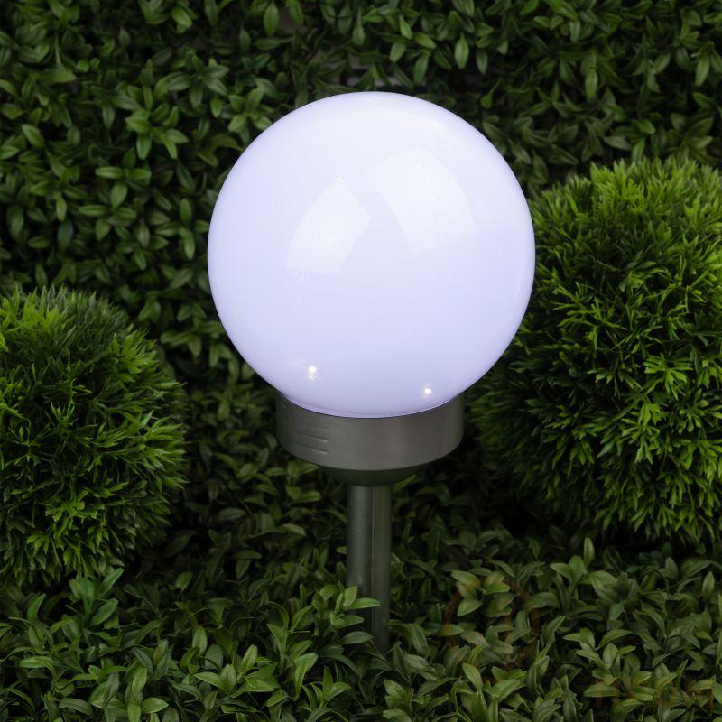 Классическая модель садового светильника в виде сферы. Мягкое свечение холодного белого света послужит прекрасным украшением при оформлении садовых дорожек и клумб.