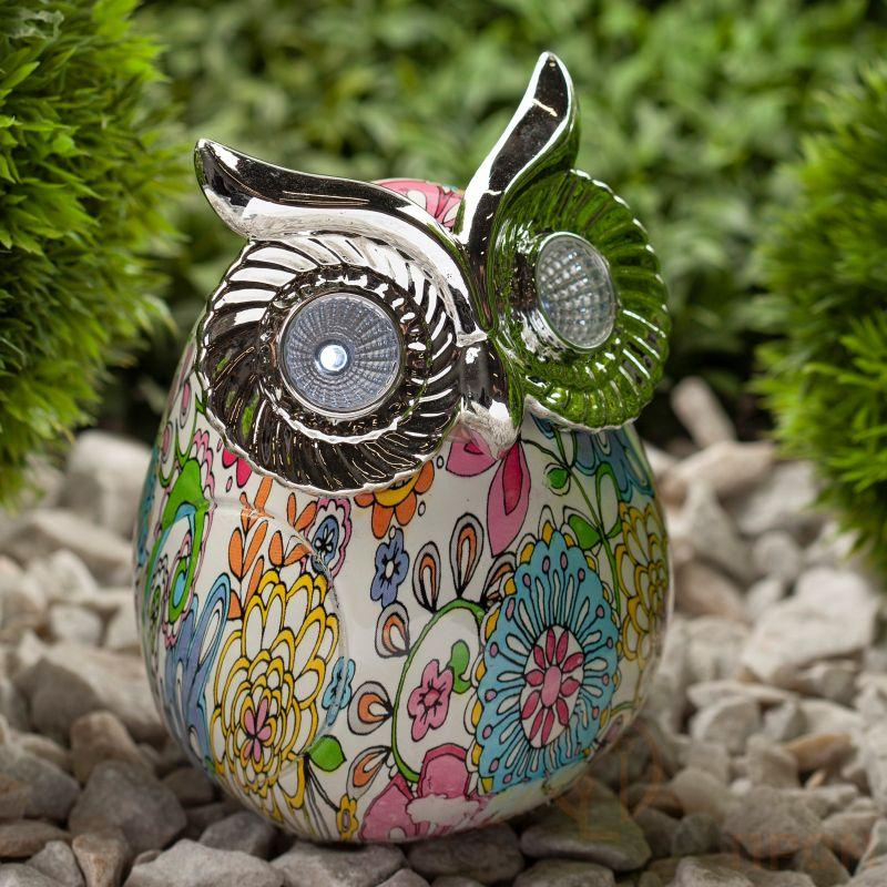 Садовый светильник на солнечной батарее ERAFYS01-03 "Сова" станет необычным персонажем на Вашей дачной территории. Небольшие внешние габариты позволят Вам разместить светодиодную подсветку в саду, украсить пруд, изящно подсветить кустарники или вход в террасу. Фигурка из искусственного камня высотой 15 см с легкостью устанавливается в землю. Светильник функционирует на солнечной батарее. Такой тип получения энергии является максимально экологичным, энергоемким, а также бесшумным. Питание происходит во включенном режиме, днем. После захода солнца пузатая сова "просыпается". Ее огромные глаза сияют белым заливным светом, создавая атмосферу сказки, волшебства. Забавный дизайн в цветочек на корпусе посеет радость и веселье среди жильцов участка, органично впишется в растительность. Сова сможет радовать Вас непрерывно в течение 8 часов. Высокая степень защиты от пыли и влаги позволяет оставлять светильник на улице даже во время дождя. Обращаем Ваше внимание, что перед использованием фигурки её необходимо включить и зарядить. Светильник заряжается в течение всего светового дня. Декоративный светильник ERAFYS01-03 "Сова" от бренда ЭРА маленький мудрый обитатель Вашего сада!