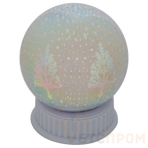 Праздничный светодиодный шар ЭРА ENGDS-14 "Новогодний лес" (арт. Б0051950) диаметром 13 см подарит теплую атмосферу вашему дому к Новому году и Рождеству! Шар выполнен из ПВХ и имеет внутреннюю проекцию елочек, которая в сочетании с холодной белой подсветкой создает ощущение глубины, шарик интересно разглядывать. Этот маленький настольный светильник станет оригинальным украшением для кухни, гостиной или спальни. Декоративный светильник работает от 3 батареек AAA и имеет класс защиты IP20 (использовать только в помещениях). Такой необычный декор для дома подарит вам ощущение праздника!