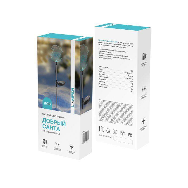 Светильник Добрый Санта LAMPER предназначен для декоративной подсветки садово-парковых зон, прогулочных дорожек, коттеджей, функционально-декоративного освещения скверов, парков и бульваров. Не подвержен коррозии, деформации под воздействием погодных условий благодаря защите от пыли и влаги класса IP65. Изделие работает на солнечной батарее. Такой тип получения энергии является наиболее экологичным, энергоемким, а также бесшумным. Питание происходит во включенном режиме, в дневное время. С наступлением темноты мелкие LED диоды загораются RGB-свечением. Уникальное оформление привнесет новые яркие акценты и украсит любое пространство своим лаконичным и оригинальным дизайном. Не требует прокладки проводов или дополнительного крепления. Предусматривает установку в грунт.