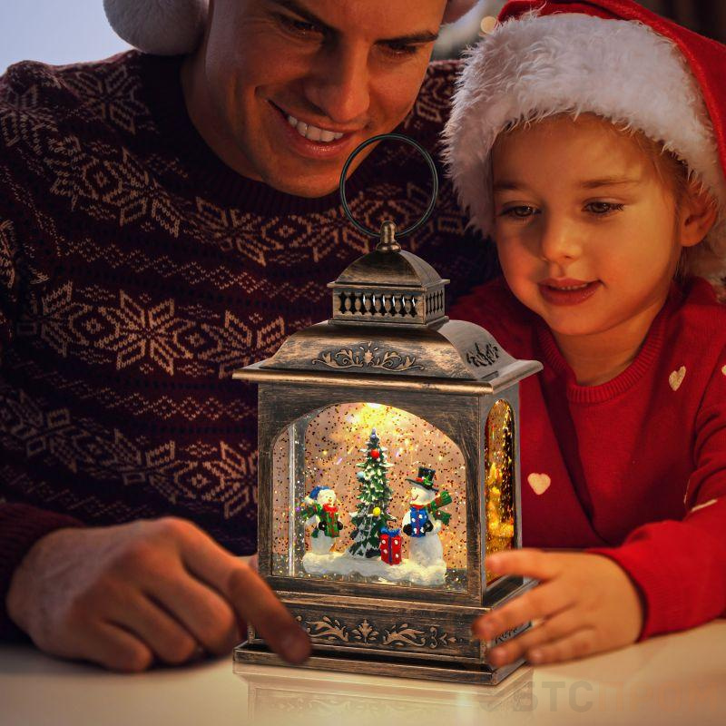 Новогодний светодиодный светильник ЭРА ENGDS-11 "Снеговики" высотой 21 см (арт. Б0051943) создаст у Вас дома атмосферу уюта и тепла! Светильник фонарь выполнен из ПВХ и окрашен под медь, внутри стекла расположены блестки, создающие эффект падающего снега. Внутри фонарика находятся фигурки двух снеговиков с елочкой, они подсвечиваются 1 светодиодной лампочкой сверху. Фонарь работает от 3 батареек АА, степень защиты IP20 (рекомендуется использовать в помещениях), автоматическое отключение через 6 часов. Этот декоративный светильник станет прекрасным украшением кухни, гостиной, а еще его можно использовать в спальне как ночник. Настольный фонарик под старину - это необычный подарок на Новый год или Рождество, который оценят и взрослые, и дети. Новогодний декор для дома всегда создает праздничное настроение!