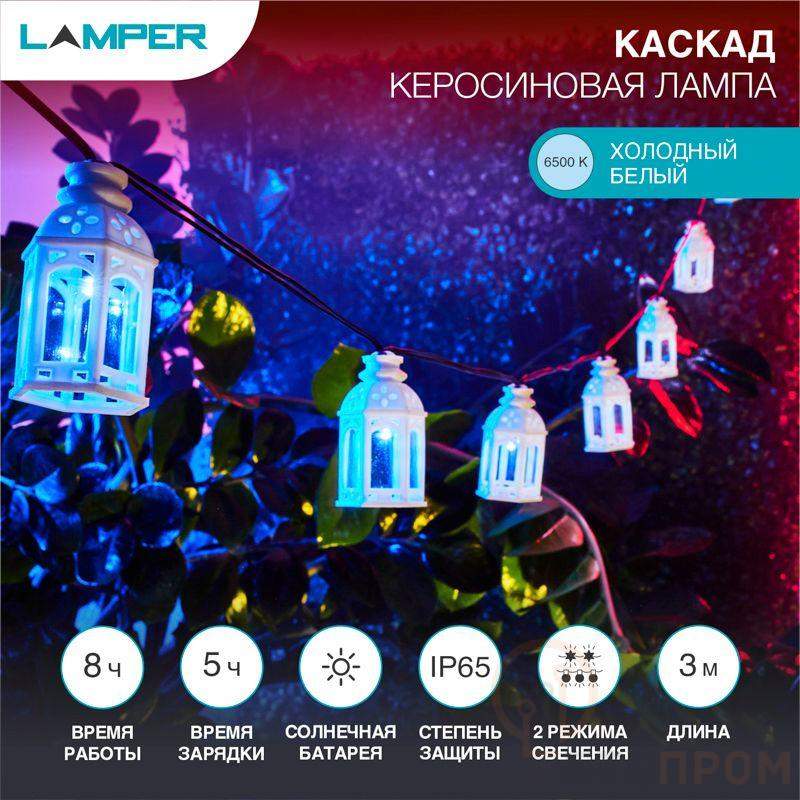 Садовая гирлянда (каскад) Керосиновая Лампа длиной 5 м от LAMPER - это оптимальное решение для украшения территории загородного дома, дачи или декорирования пространства перед торжеством. Изделие оснащено солнечной панелью и аккумулятором: заряжается днем в течение 5 часов, а с наступлением темноты дарит приятное холодное белое свечение на протяжении 8 часов. Гирлянда-каскад имеет 2 режима работы: постоянный и мигающий. Устройство не требует прокладки проводов и дополнительных элементов установки. 10 ламп расположены на шнуре длиной 3 м. Еще 2 м провода идут к солнечной панели. Так, гирлянда легко крепится в любом месте. При этом панель незаметно размещается по соседству. Ее можно положить на плоскую поверхность или вставить в грунт (в комплекте идет прочный пластиковый колышек). Каскад имеет высокий уровень пыле- и влагозащиты IP65, поэтому может использоваться в непогоду без навеса.