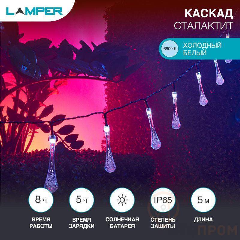 Светильник светодиодный садовый Каскад Сталактит 5м LED тепл. бел. 3Вт IP65 с выносной солнечн. панелью 1м аккум. 2 режима работы: мигание и постоян. свечение Lamper 602-239