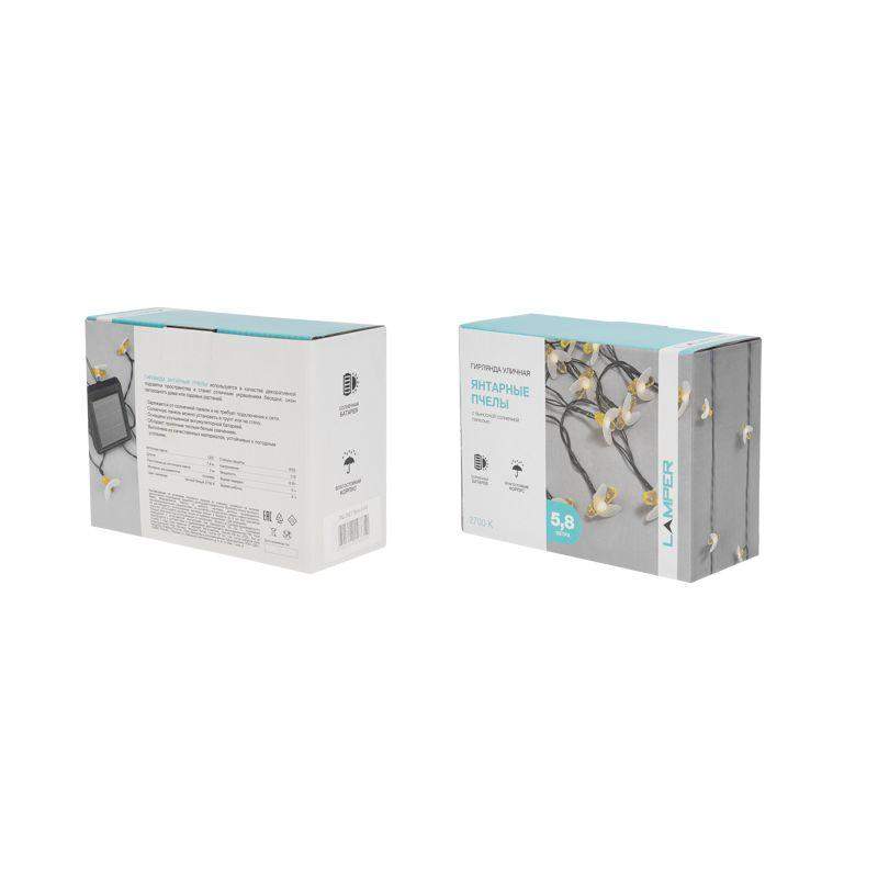 Садовая гирлянда (каскад) Янтарные Пчелы LAMPER - это оптимальное решение для украшения территории загородного дома, дачи или декорирования пространства перед торжеством. Изделие оснащено солнечной панелью и аккумулятором: заряжается днем в течение 5 часов, а с наступлением темноты дарит приятное теплое белое свечение на протяжении 8 часов. Устройство не требует прокладки проводов и дополнительных элементов установки. 30 пластиковых пчел расположены на шнуре длиной 5,8 м. Еще 2 м провода идут к солнечной панели. Так, гирлянда легко крепится в любом месте. При этом панель незаметно размещается по соседству. Ее можно положить на плоскую поверхность или вставить в грунт (в комплекте идет прочный пластиковый колышек). Каскад имеет высокий уровень пыле- и влагозащиты IP65, поэтому может использоваться в непогоду без навеса.