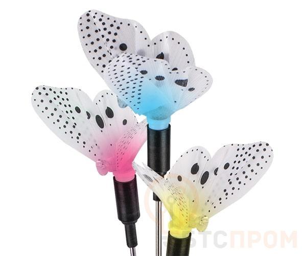 Ландшафтный мультицветный светильник «бабочки» с солнечной батареей. Предназначен для декоративной подсветки клумб, газонов, альпийских горок, дорожек на садовых и дачных участках, а также на дворовых территориях. Установите светильник так, чтобы на солнечную панель попадал солнечный свет. В темное время суток светильник светится от аккумулятора, заряженного в светлое время суток. Время непрерывной работы от полностью заряженного аккумулятора: 8 часов. Время зарядки аккумулятора: 8 часов. Автоматическое включение/выключение светильника при наступлении темного/светлого времени суток (фотосенсор).