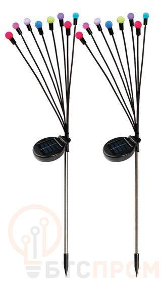 Комплект из 2-х ландшафтных мультицветных светильников «Светлячки» с солнечной батареей. Предназначены для декоративной подсветки клумб, газонов, альпийских горок, дорожек на садовых и дачных участках, а также на дворовых территориях. В темное время суток светильник светится от аккумулятора Ni-MH 600мАч, заряженного в светлое время суток. Время непрерывной работы от полностью заряженного аккумулятора: 8 часов. Время зарядки аккумулятора: 6-8 часов. Источники света - 8 RGB светодиодов. Автоматическое включение/выключение светильника при наступлении темного/светлого времени суток (фотосенсор). Высота светильников 70 см. Степень защиты IP44