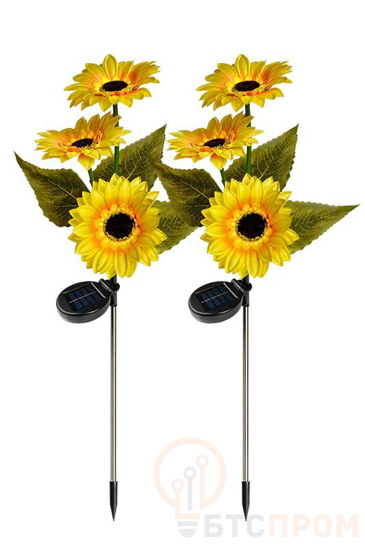 Комплект из 2-х ландшафтных светильников «Подсолнухи» с солнечной батареей. Предназначены для декоративной подсветки клумб, газонов, альпийских горок, дорожек на садовых и дачных участках, а также на дворовых территориях. В темное время суток светильник светится от аккумулятора Ni-MH 600мАч, заряженного в светлое время суток. Время непрерывной работы от полностью заряженного аккумулятора: 8 часов. Время зарядки аккумулятора: 6-8 часов. Источники света - 36 светодиодов. Автоматическое включение/выключение светильника при наступлении темного/светлого времени суток (фотосенсор). Высота светильников 70 см. Степень защиты IP44