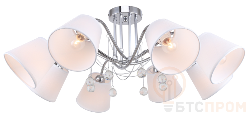 Универсальная классическая люстра Rivoli Betsy, под 8 ламп, с хрустальным декором арт. 2069-308. Дизайнерские люстры Betsy от итальянского бренда Rivoli это лаконичный хромированный корпус из лёгкого прочного металла, плафоны из белой абажурной ткани со свойствами защиты от грязи и пыли, подвески изпрозрачного хрусталя на миниатюрных декоративных цепочках. Люстры потолочные коллекции Rivoli Betsy применяются с лампочками Е14 40 Вт, для них можно купить экономичные светодиодные источники света. Потолочные люстры на штанге современный вариант основного освещения в кабинет, в гостиную, на кухню, в спальню, в детскую комнату, в загородный дом.