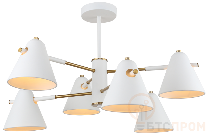 Rivoli Chelsea – полностью укомплектованная коллекция освещения в стиле лофт, в стиле модерн: люстра потолочная под 6 ламп (арт. 3141-306) потолочная люстра под 8 ламп (арт. 3141-308), бра под 1 лампу (арт. 3141-401), подвесной светильник под 1 лампу (арт. 3141-201), подвесной светильник под 3 лампы (3141-203). Популярная люстра коллекции – Rivoli Chelsea под 6 ламп. Эта люстра оптимальна на потолок стандартной жилой комнаты. Корпус и плафоны люстры изготовлены из металла и окрашены в матовый белый цвет гальваническим способом. В декоре люстры присутствуют элементы золотого цвета. Свет люстры в гостиную Chelsea направлен вниз, что обеспечит жильцов дома или квартиры качественным ярким освещением с направленным световым потоком. Освещаемая площадь металлической люстры лофт Rivoli Chelsea – до 18 м2.