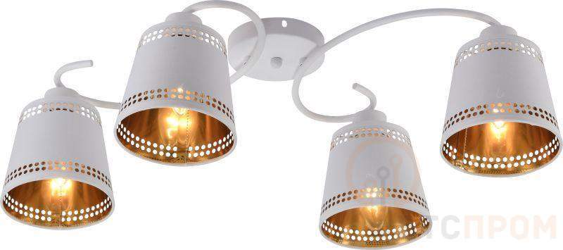 Эффектная люстра потолочная в стиле модерн - Rivoli Yvonne (арт. 9166-304). Люстра под 4 лампы Е14 40 Вт. Трапециевидные плафоны из металла имеют декоративную перфорацию. Основной цвет этой красивой современной люстры белый. Применено стойкое порошковое окрашивание по металлу. Изнутри плафоны люстры окрашены в золотой цвет, что делает искусственный свет более тёплым, праздничным. Плафоны люстры держат элегантные рожки с плавными завитками. В дополнение к данной люстре с 4 плафонами в коллекции Yvonne итальянского бренда Rivoli присутствует люстра с 6 плафонами арт. 9166-306. Эти дизайнерские люстры помогут оформить интерьер в стиле модерн, классика, скандинавский, восточный, эклектика, современная классика, кантри.
