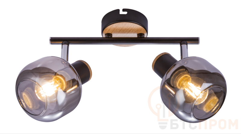 Броский дизайн этих светильников достигается сочетанием контрастных оттенков затемнённых выдувных плафонов и тёмного металлического каркаса с декоративными элементами из светлого дерева. Споты оснащены долговечными поворотными механизмами высокого качества с надёжной фиксацией. Коллекция представлена настенно-потолочным светильником на 2 лампы.