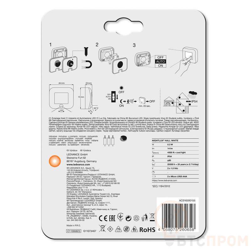 Светильник светодиодный NIGHTLUX Hall от LEDVANCE — это компактное и надежное решение для локального освещения и декоративной подсветки. Модель обладает мощностью 0.25Вт и выдает мягкий нейтральный белый свет с цветовой температурой 4000K, что создает комфортную и не утомляющую глаза атмосферу.