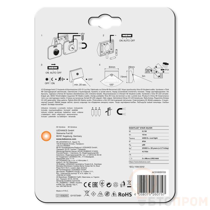 Светильник NIGHTLUX Stair 0.25Вт 4000К 10лм IP54 3х1.5В LR03 с сенсором серебр. LEDVANCE 4058075260757