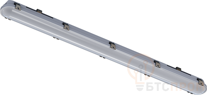 Конструкция. Светильник имеет ударопрочный корпус из поликарбоната. Рассеиватель выполнен из поликарбоната и зафиксирован клипсами из металла. Оснащен удобной нажимной клеммной колодкой для подключения. Внутри светильников реализована сквозная проводка, что позволяет соединять их в линию. Установка. Устанавливается на опорную поверхность, а также крепится на подвесах (в комплект не входят) к потолку Оптическая часть. Опаловый рассеиватель, изготовленный из ударопрочного светотехнического поликарбоната, обеспечивает равномерный мягкий свет. Источник света. Светодиоды HONGLI 2835 повышенной эффективности. Области использования. Промышленные объекты, объекты ЖКХ Дополнительная информация. Светильник укомплектован драйвером, управляемым по протоколу DALI 2.0.