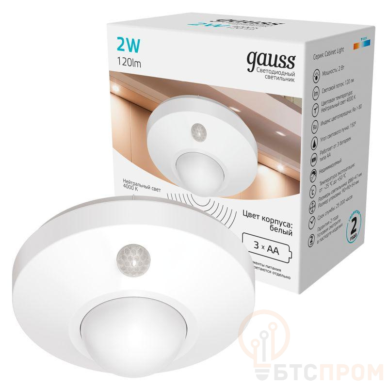Светильник светодиодный 2Вт 4000К IP20 120лм d86х18мм ДПО круг автономный сенсорный с датчиком движения GAUSS CL001