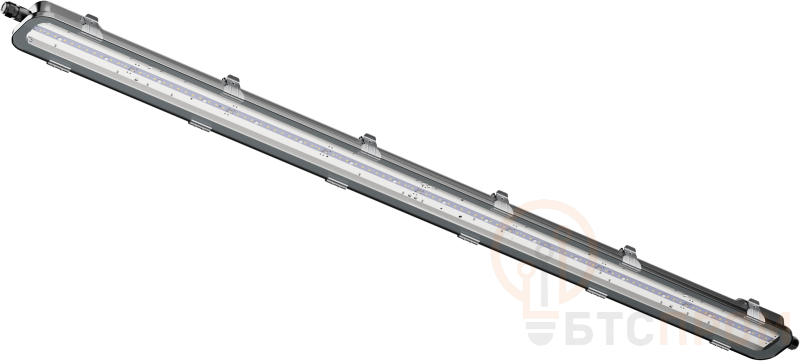 Конструкция. Штампованный корпус из нержавеющей стали марки AISI304 позволяет эксплуатировать светильник в тяжелых условиях. Силиконовый уплотнитель и клипсы жесткой фиксации надежно притягивают стекло к корпусу, что обеспечивает степень защиты IP66/IP67. Кабельный ввод с интегрированной клеммной колодкой позволяет подключать светильники без разбора корпуса и упрощает монтаж светильников в линию. Оптическая часть. Рассеиватели изготовлены из закаленного стекла. Модульные линзы собственного производства из поликарбоната образуют угол рассеяния светового потока 60° или 90°. Модификации светильников без линз имеют угол светового потока 120°. Источник света. Используются светодиоды HONGLI 2835 повышенной эффективности. Способ монтажа. Монтируется на опорную поверхность, а также крепится на подвесах (в комплект не входят) к потолку. Входящая в монтажный комплект скоба позволяет поворачивать светильник на 30° в обе стороны. Для регулировки угла наклона в пределах 180° используйте комплект КМ-01-2 (приобретается отдельно). При необходимости подвеса светильника на трос используйте комплект для подвесного монтажа КМП-01-0 (приобретается отдельно). Области использования. Промышленные объекты, объекты ЖКХ. Дополнительная информация. Доступны модели: с блоком аварийного питания.