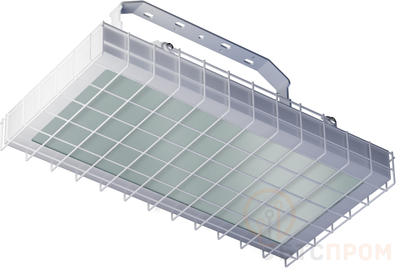 Конструкция. Цельнометаллический герметичный сварной корпус из листовой стали, покрытый белой порошковой краской, крепление рассеивателя на силиконовый уплотнитель и герметик обеспечивает уровень пылевлагозащиты IP65. Удобное подключение без разбора посредством выведенного провода. Конструкция корпуса позволяет регулировать угол наклона светильника от 0° до 180° с шагом 15°. Установка. Монтируется на опорную поверхность при помощи поворотной лиры. Оптическая часть. Рассеиватели изготовлены из закаленного матированного стекла. Источник света. Используются светодиоды HONGLI 2835 повышенной эффективности. Области использования. Промышленные и спортивные объекты. Подходят для помещений с категорией пожароопасных зон П-IIa. Дополнительная информация. Для дополнительной защиты есть модификации с защитной решеткой._x000D_ Доступны модели: с блоком аварийного питания