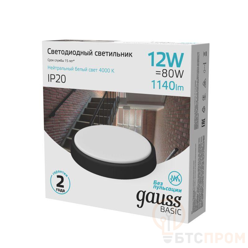 Светильник светодиодный Basic 12Вт 4000К IP20 1140лм 220-240В d135х33мм ДБП круг настенно-потолочный черн. GAUSS 193411312B