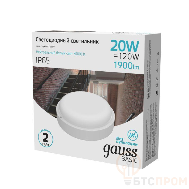 Светильник светодиодный Basic 20Вт 4000К IP65 1900лм 220-240В d175х52мм ДБП круг настенно-потолочный бел. GAUSS 126418220B