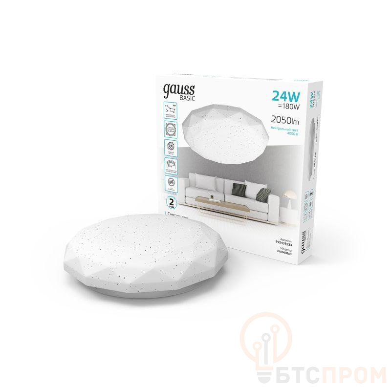 Светильник светодиодный Basic 24Вт 4000К IP20 d340х75мм НПС настенно-потолочный Space Diamond GAUSS 995439224