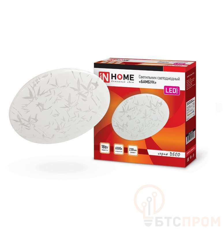 Светодиодный светильник БАМБУК серии DECO от ТМ In Home в светлом матовом корпусе украшен принтом в виде стилизованных листьев бамбука. Согласно древнему китайскому учению фен-шуй, изображение этого растения приносит в дом удачу, счастье и процветание. Линейка светильников БАМБУК представлена в трех размерах от 190 до 350 мм. Несколько вариаций мощности (в диапазоне от 12 Вт до 36 Вт) позволяют подобрать оптимальный осветительный прибор, в зависимости от конфигурации и габаритов помещения. Применение Светодиодные светильники БАМБУК серии DECO предназначены для внутреннего освещения жилых помещений, подъездов и сферы ЖКХ, офисных и административных учреждений, магазинов, а также холлов, коридоров, лестничных пролётов, подсобок и других помещений вспомогательного назначения. Преимущества Современные светильники серии DECO, работающие на основе последнего поколения светодиодов, обеспечивают яркий равномерный световой поток при максимальной экономии электроэнергии. Отсутствие пульсации гарантирует сохранность здоровья глаз. Светодиодные светильники являются одним из самых экологически безвредных источников света и не требуют специальной утилизации и переработки. Светильники получили сертификат таможенного союза EAC. Производятся по ГОСТу Р МЭК 60598-1-2011. Монтаж Светодиодные светильники серии DECO применяются для работы в сетях переменного тока напряжением 230В ± 10% с частотой 50 герц. Перед установкой следует убедиться в правильности напряжения питающей сети и наличии защитного устройства в цепи (автоматический выключатель, предохранитель). Этапы установки: отключите сетевое напряжение, извлеките светильник из упаковки, открутите плафон светильника, повернув его по часовой стрелке. Через клеммную колодку подключите подготовленные концы проводов осветительного прибора к проводу сети. Установите светильник на поверхности и зафиксируйте при помощи дюбелей и саморезов. Сборку светильника следует осуществлять в обратной последовательности.