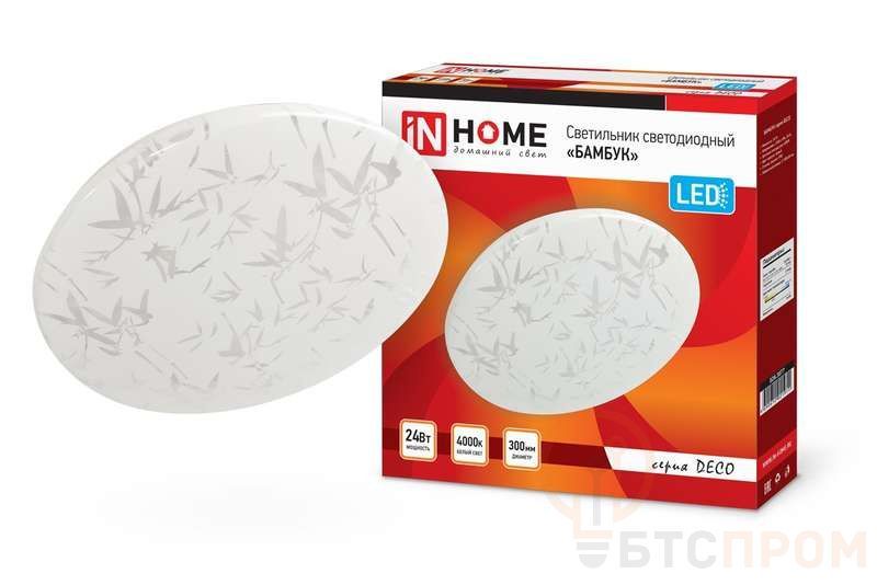 Светодиодный светильник БАМБУК серии DECO от ТМ In Home в светлом матовом корпусе украшен принтом в виде стилизованных листьев бамбука. Согласно древнему китайскому учению фен-шуй, изображение этого растения приносит в дом удачу, счастье и процветание. Линейка светильников БАМБУК представлена в трех размерах от 190 до 350 мм. Несколько вариаций мощности (в диапазоне от 12 Вт до 36 Вт) позволяют подобрать оптимальный осветительный прибор, в зависимости от конфигурации и габаритов помещения. Применение Светодиодные светильники БАМБУК серии DECO предназначены для внутреннего освещения жилых помещений, подъездов и сферы ЖКХ, офисных и административных учреждений, магазинов, а также холлов, коридоров, лестничных пролётов, подсобок и других помещений вспомогательного назначения. Преимущества Современные светильники серии DECO, работающие на основе последнего поколения светодиодов, обеспечивают яркий равномерный световой поток при максимальной экономии электроэнергии. Отсутствие пульсации гарантирует сохранность здоровья глаз. Светодиодные светильники являются одним из самых экологически безвредных источников света и не требуют специальной утилизации и переработки. Светильники получили сертификат таможенного союза EAC. Производятся по ГОСТу Р МЭК 60598-1-2011. Монтаж Светодиодные светильники серии DECO применяются для работы в сетях переменного тока напряжением 230В ± 10% с частотой 50 герц. Перед установкой следует убедиться в правильности напряжения питающей сети и наличии защитного устройства в цепи (автоматический выключатель, предохранитель). Этапы установки: отключите сетевое напряжение, извлеките светильник из упаковки, открутите плафон светильника, повернув его по часовой стрелке. Через клеммную колодку подключите подготовленные концы проводов осветительного прибора к проводу сети. Установите светильник на поверхности и зафиксируйте при помощи дюбелей и саморезов. Сборку светильника следует осуществлять в обратной последовательности.