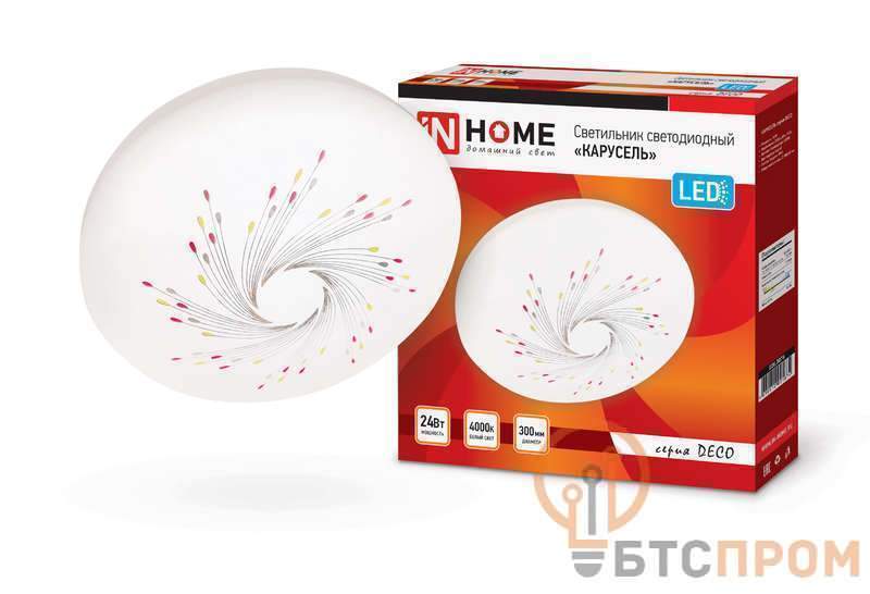 Светодиодные светильники КАРУСЕЛЬ серии DECO от ТМ In Home в классическом белом матовом корпусе с яркими цветовыми акцентами добавят нотку жизнерадостности в интерьер любого помещения. Линейка светильников КАРУСЕЛЬ представлена в трех размерах от 190 до 350 мм. Несколько вариаций мощности (в диапазоне от 12 Вт до 36 Вт) позволяют подобрать оптимальный осветительный прибор, в зависимости от конфигурации и габаритов помещения. Применение Светодиодные светильники КАРУСЕЛЬ серии DECO предназначены для внутреннего освещения жилых помещений, подъездов и сферы ЖКХ, офисных и административных учреждений, магазинов, а также холлов, коридоров, лестничных пролётов, подсобок и других помещений вспомогательного назначения. Преимущества Современные светильники серии DECO, работающие на основе последнего поколения светодиодов, обеспечивают яркий равномерный световой поток при максимальной экономии электроэнергии. Отсутствие пульсации гарантирует сохранность здоровья глаз. Светодиодные светильники являются одним из самых экологически безвредных источников света и не требуют специальной утилизации и переработки. Светильники получили сертификат таможенного союза EAC. Производятся по ГОСТу Р МЭК 60598-1-2011. Монтаж Светодиодные светильники серии DECO применяются для работы в сетях переменного тока напряжением 230В ± 10% с частотой 50 герц. Перед установкой следует убедиться в правильности напряжения питающей сети и наличии защитного устройства в цепи (автоматический выключатель, предохранитель). Этапы установки: отключите сетевое напряжение, извлеките светильник из упаковки, открутите плафон светильника, повернув его по часовой стрелке. Через клеммную колодку подключите подготовленные концы проводов осветительного прибора к проводу сети. Установите светильник на поверхности и зафиксируйте при помощи дюбелей и саморезов. Сборку светильника следует осуществлять в обратной последовательности.