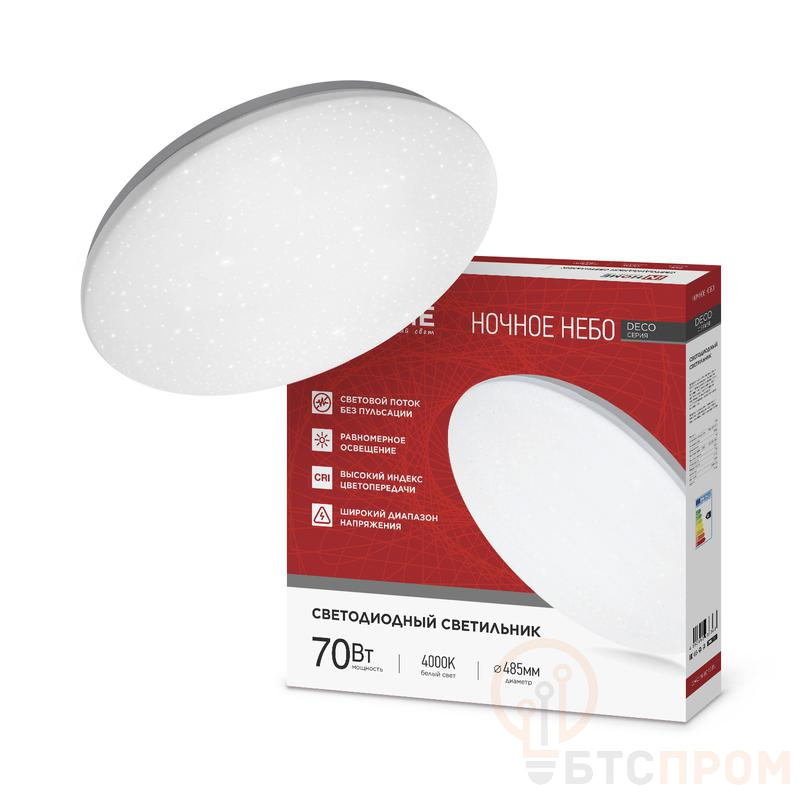 Светодиодный светильник DECO «Ночное небо» — это современное и эффективное решение для основного освещения коммерческих и промышленных помещений. Модель мощностью 70 Вт обеспечивает мощный световой поток 6300 лм с нейтральной цветовой температурой 4000K, что создает комфортную и рабочую атмосферу без искажения цветов.