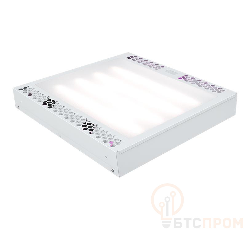 Светодиодный светильник FM 595 44W 4000K PRISM с двухобъемной конструкцией. В нижнем объеме расположена осветительная часть со светодиодными модулями. В верхнем расположена бактерицидная часть. Она состоит из двух УФ ламп с длиной волны около 254 нм и бесшумных вентиляторов, которые обеспечивают достаточную обработку воздуха в помещении до 30 кв.м (при стандартной высоте потолка). Используется для освещения и обеззараживания воздуха в офисах, помещениях медицинских учреждений. Устанавливается на потолок Армстронг. Материал корпуса: сталь. Материал рассеивателя: полистирол. Тип рассеивателя: микропризма (PRISM). Степень защиты: IP20. Климатическое исполнение: УХЛЗ.1.