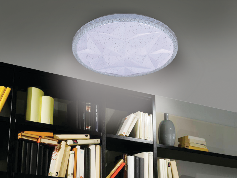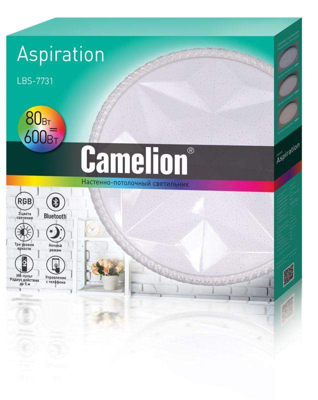 Светильники светодиодные настенно-потолочные с управлением с ИК-пульта Camelion предназначены для внутреннего освещения общественных, бытовых и подсобных помещений. Camelion LBS-7731 (LED св-к, 80Вт), диаметр 500мм, источник света - встроенные светодиоды, мощность 80Вт, плавное переключение цветности и яркости с помощью пульта и мобильного приложения, 3000-6000К, функция RGB. макс свет. поток 7800лм. Материал светильника/ плафона - Металл/пластик