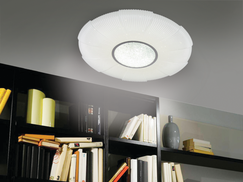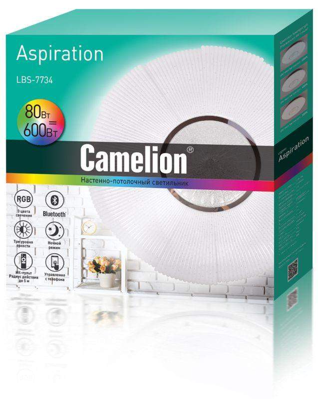 Светильники светодиодные настенно-потолочные с управлением с ИК-пульта Camelion предназначены для внутреннего освещения общественных, бытовых и подсобных помещений. Camelion LBS-7734 (LED св-к, 80Вт), диаметр 500мм, источник света - встроенные светодиоды, мощность 80Вт, плавное переключение цветности и яркости с помощью пульта и мобильного приложения,3000-6000К, функция RGB. макс свет. поток 7800лм.Материал светильника/ плафона - Металл/пластик