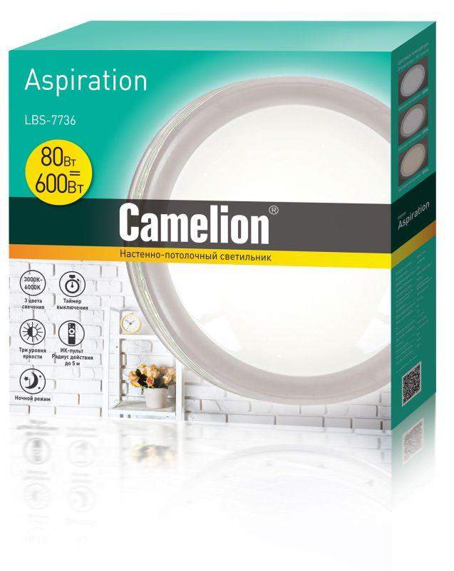 Светильники светодиодные настенно-потолочные с управлением с ИК-пульта Camelion предназначены для внутреннего освещения общественных, бытовых и подсобных помещений. Camelion LBS-7736 (LED св-к, 80Вт), диаметр 500мм, источник света - встроенные светодиоды, мощность 80Вт, макс световой поток 7800лм, IP 20, цв. температура 3000K/4000K/6000K. Материал светильника/ плафона - Металл/пластик