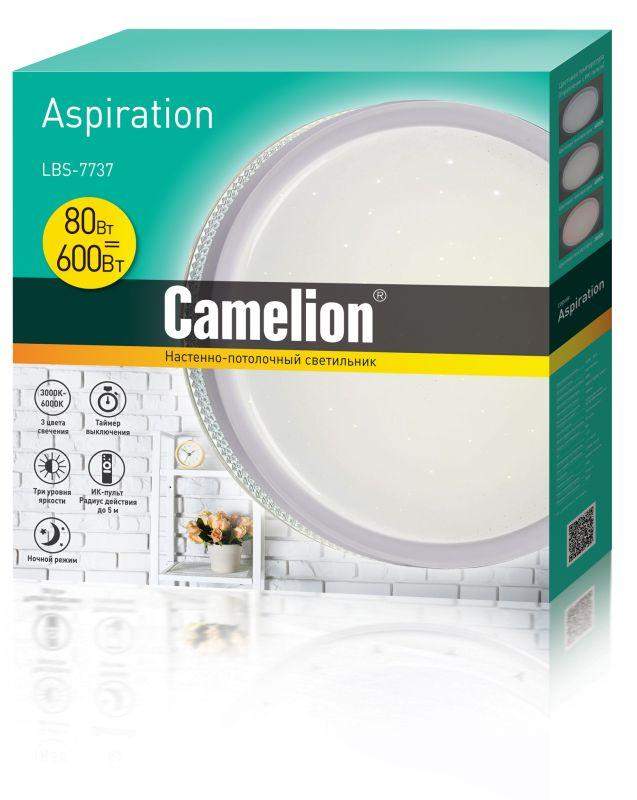 Светильники светодиодные настенно-потолочные с управлением с ИК-пульта Camelion предназначены для внутреннего освещения общественных, бытовых и подсобных помещений. Camelion LBS-7737 (LED св-к, 80Вт), диаметр 500мм, источник света - встроенные светодиоды, мощность 80Вт. макс световой поток 7800лм, IP 20, цв. температура 3000K/4000K/6000K. Материал светильника/ плафона - Металл/пластик
