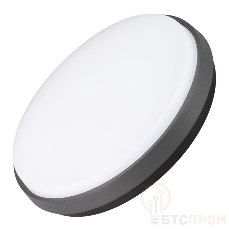 Накладной светильник 30Вт, серый алюминиевый корпус, матовый рассеиватель из поликарбоната. Цвет ТЕПЛЫЙ БЕЛЫЙ 3000K, св.поток 2760лм, CRI(Ra)>80, угол 110°. Размер Ф300x50мм. IP54. Питание AC220-240V, 30Вт, встроенный драйвер.