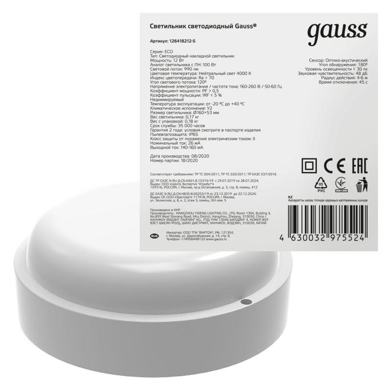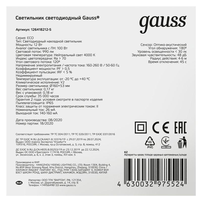 Светильник светодиодный Lite 12Вт 4000К IP65 940лм d140х48мм ДБП круг настенно-потолочный с оптико-акустическим датчиком GAUSS 126418212-S