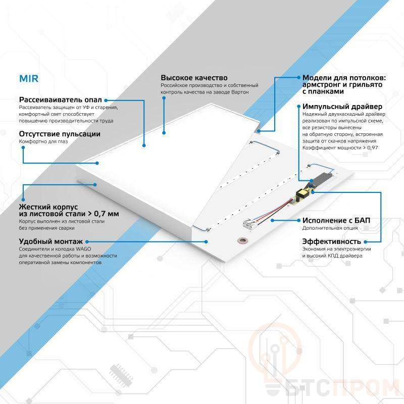 Светодиодные светильники Gauss серии MiR предназначены для освещения коммерческих объектов, офисных помещений, учебных заведений и т.д. Данный светильник производится из высококачественных материалов на территории Российской Федерации. Имеются модификации для установки светильников в потолки типа Армстронг или Грильято, а так же с блоком аварийного питания.