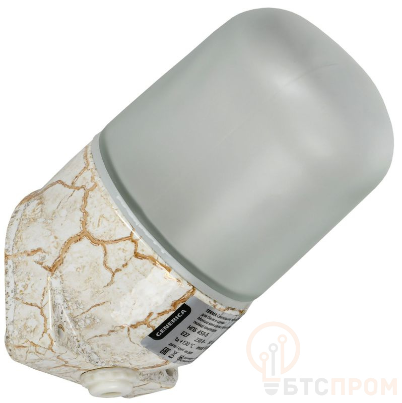 Светильник НПБ серии 450 торговой марки GENERICA предназначен для применения в бытовых помещениях с высоким содержанием пыли и влаги, а так же с предельной температурой окружающей среды до 140 °С, например в банях и саунах. Светильник имеет полностью керамический корпус и стеклянный плафон, что обеспечивает высокую термическую надёжность, а так же приятный внешний вид. Для уплотнения соединения между корпусом и рассеивателем используется силиконовая прокладка способная выдержать длительную эксплуатацию при высоких температурах, при этом не происходит деформация и высыхание на всем гарантийном периоде эксплуатации. Некоторые модели светильников могут быть использованы для сквозной проводки, так как имеют 2 гермоввода. Светильники имеют три вида цветового исполнения: классический белый, насыщенный шоколадный (коричневый) и узорный мраморный! Так же мы предлагаем 3 вида корпуса: классический прямой, наклонный под 45° и угловой.