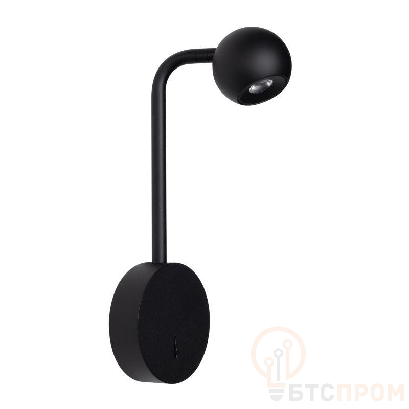 Накладной настенный светильник. Мощность 6 Вт, св. поток 540 лм, 90 лм/Вт, теплый 3000К, CRI>90, угол 30°, напряжение питания 230 В. Черный корпус из алюминия (основание, ножка, светоизлучаль в форме шара), степень защиты IP20. Размер основания O100?30 мм, размер ножки O12,5?175х72 мм, размер светоизлучателя O65?55,5 мм. Драйвер встроенный, пульсация <1%