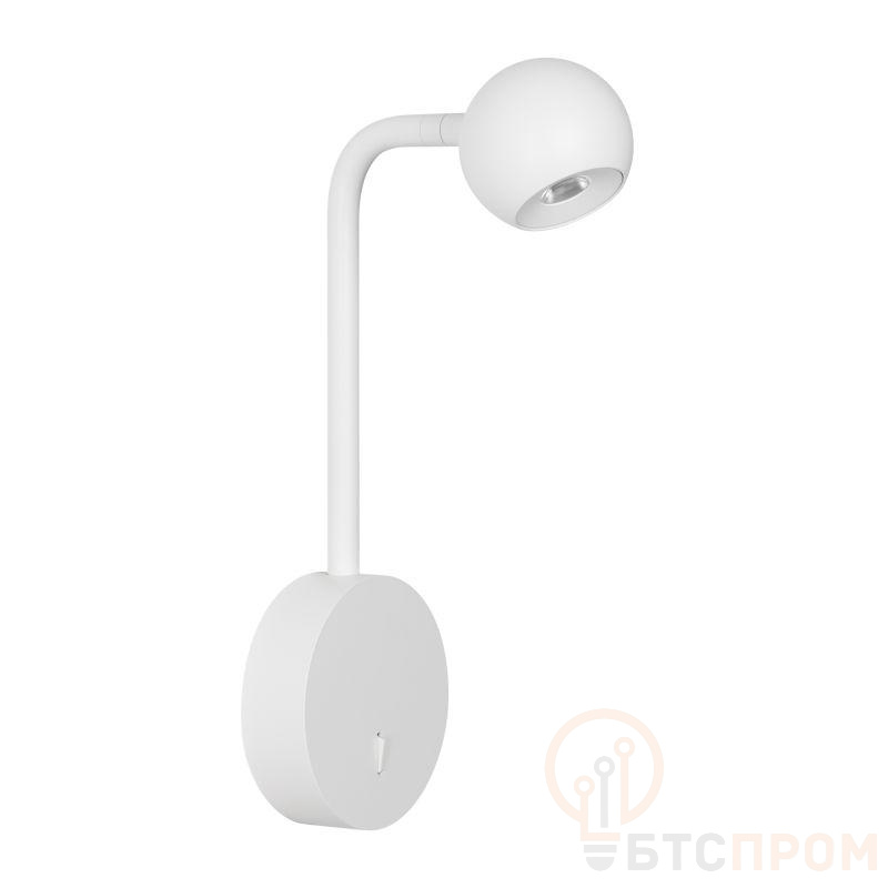 Накладной настенный светильник. Мощность 6 Вт, св. поток 540 лм, 90 лм/Вт, теплый 3000К, CRI>90, угол 30°, напряжение питания 230 В. Белый корпус из алюминия (основание, ножка, светоизлучаль в форме шара), степень защиты IP20. Размер основания O100?30 мм, размер ножки O12,5?175х72 мм, размер светоизлучателя O65?55,5 мм. Драйвер встроенный, пульсация <1%
