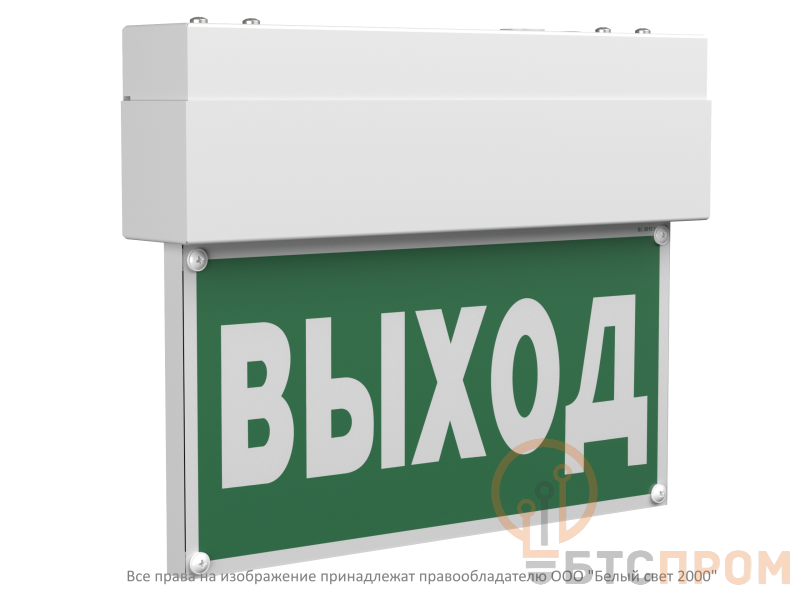 Оповещатель пожарный световой BS-TERON-10-F1-12 имеет расстояние распознавания 30 метров. Световой указатель предназначен для обозначения эвакуационных выходов и направления движения по путям эвакуации. Высокой степень защиты корпуса от внешних воздействий, и возможности двухстороннего размещения знаков безопасности, различным вариантам крепления и размещения, дает возможность применять данный световой указатель на объектах разного профиля от торговых и вставочных центров, до пыльных помещений с высокой влажностью.. Совместимая серия знака безопасности BL-3015. Модель имеет централизованный режим работы, нормируемая продолжительности аварийной работы 0 ч. Номинальная потребляемая мощность 0,42 Вт. Класс защиты от поражения электрическим током: III Поддерживается тестирование и управление: Нет Материал корпуса сталь, порошковая эмаль Материал рассеивателя полиметилметакрилат Степень защиты от внешних воздействий IP65 Монтаж светового указателя производится на поверхность стен или потолка. На поверхность стен с помощью входящего в комплект кронштейна. На поверхность стен с помощью двух кронштейнов. Второй кронштейн входит в комплект аксессуаров BS-KA-2 White и заказывается отдельно. При монтаже один кронштейн переставляется из центрального положения в крайнее положение, второй кронштейн устанавливается на противоположную сторону. Крепление к потолку с помощью одной или двух шпилек М8 необходимой длины. Шпильки в комплект поставки не входят. При креплении двумя шпильками требуется дополнительно заказать комплект аксессуаров BS-KA-2 White. Дополнительный кронштейн позволят равномерно распределить нагрузку при креплении на два узла. Подвес к потолку на тросах необходимой длины. Тросы и рым-болты в комплект не входят.