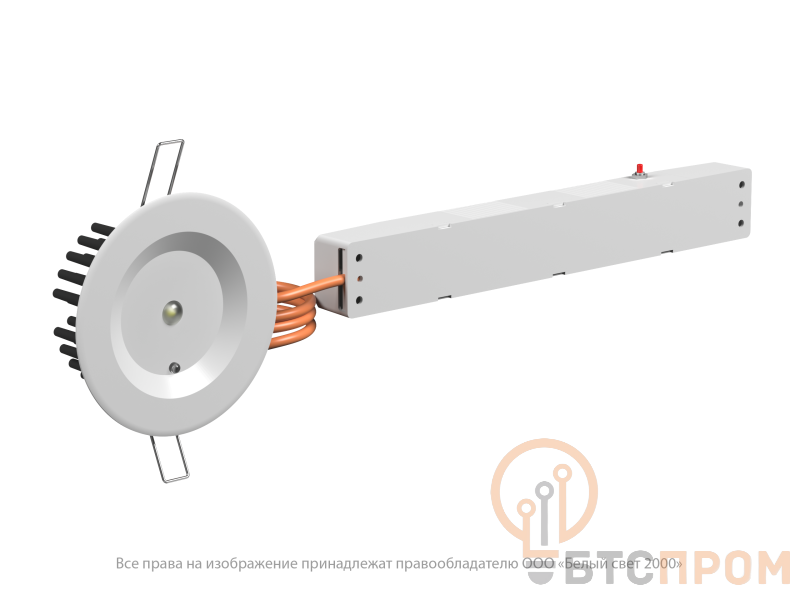 Модель имеет встроенный аккумулятор, который автоматически включается при отключении основного электропитания, обеспечивая непрерывную работу. На лицевой панели расположена индикация состояния заряда. Благодаря высокой степени пылевлагозащиты IP65, данный светильник может использоваться в сложных условиях.