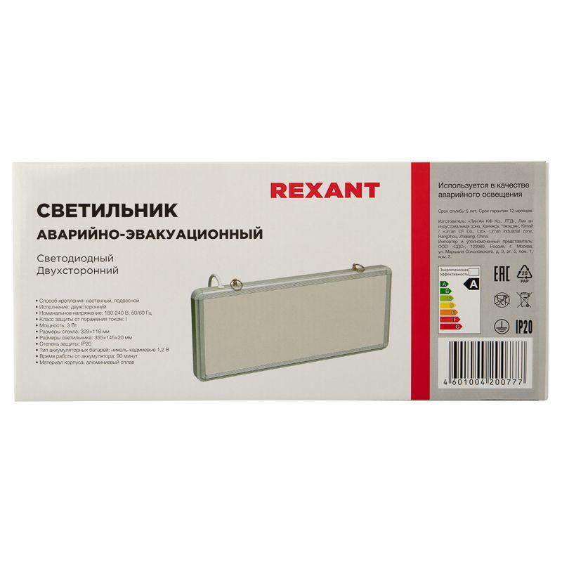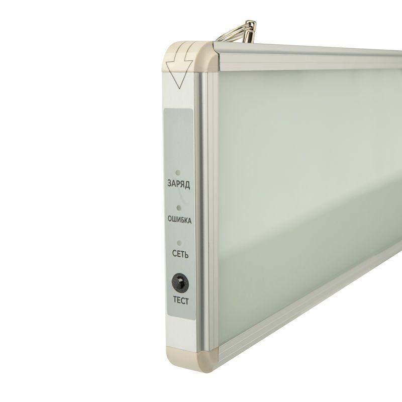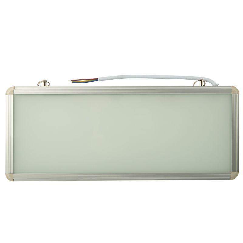 Аварийно-эвакуационные светильники предназначены для установки во внутренних помещениях промышленных предприятий, гражданских зданий и сооружений. Обеспечивает освещение и сообщение необходимой информации (направление выхода, выхода) в случае прекращения подачи электроэнергии. Источником света в светильнике является светодиодная линейка, использование которой дает преимущество в сравнении с применяемыми, в настоящее время, люминесцентными лампами и лампами накаливания. Светильник имеет подвесное крепление. Световые указатели имеют встроенный аккумулятор и сохраняют работоспособность при отсутствии напряжения (230 В) в течение 90 минут. Корпус светильника выполнен из алюминиевого сплава. Функцию плафона выполняет стеклянная панель. Способ крепления: подвесной Исполнение: двухсторонний Номинальное напряжение: 230 В, 50 Гц Мощность: 3 Вт Степень защиты: IP20 Тип аккумуляторных батарей: никель-кадмиевые 1.2 В. Время работы от аккумулятора: 90 минут Материал корпуса: алюминиевый сплав Источник света: LED Размеры стекла: 329x118 мм Размеры светильника: 355x145x26 мм