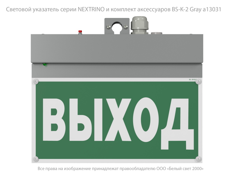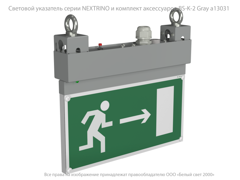 Световой указатель BS-NEXTRINO-71-S1-INEXI2 Gray имеет расстояние распознавания 30 метров. Световой указатель предназначен для обозначения эвакуационных выходов и направления движения по путям эвакуации в помещениях с повышенными требованиями к внешнему виду световых приборов и нормальными условиями эксплуатации: в офисно-административных зданиях, в торговых и выставочных залах, магазинах, кафе и т.д.. Совместимая серия знака безопасности BL-3015. Модель имеет постоянный режим работы, нормируемая продолжительности аварийной работы 1 ч. Номинальная потребляемая мощность 6,30 Вт. Класс защиты от поражения электрическим током: I Поддерживается тестирование и управление: Кнопка "Тест", TELECONTROL Материал корпуса сталь, порошковая эмаль Материал рассеивателя полиметилметакрилат Степень защиты от внешних воздействий IP40 Монтаж светового указателя производится на поверхность стен или потолка: Крепление е к стене производится с помощью одного входящего в комплект кронштейна; Для крепления на потолок или поверхность стен с помощью двух кронштейнов. Второй кронштейн BS-KA-2 заказывается отдельно. Возможно крепление к потолку с помощью одной или двух шпилек М8 необходимой длины. Шпильки в комплект поставки не входят. При креплении двумя шпильками требуется заказать дополнительно кронштейн BS-KA-2; Возможен подвес к потолку на тросах необходимой длины. Тросы и рым-болты в комплект не входят.