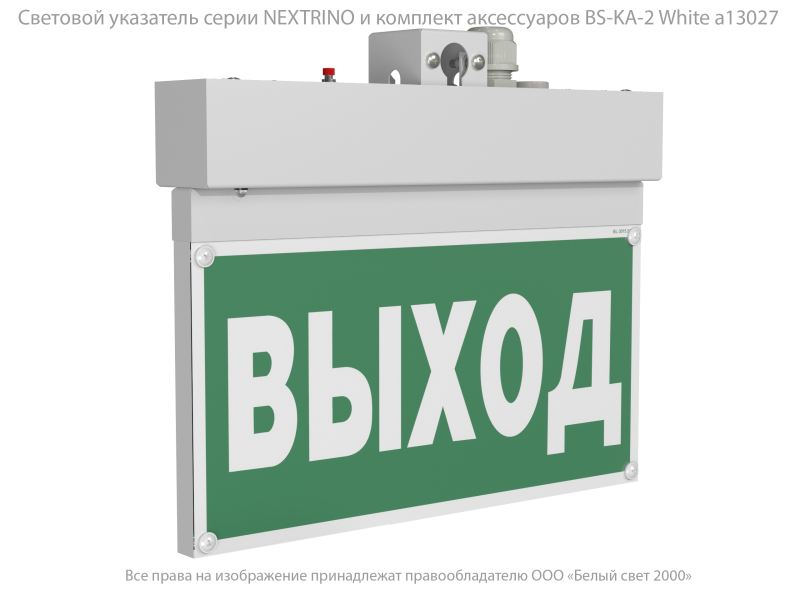 Световой указатель BS-NEXTRINO-71-S1-INEXI3-MSS3 White имеет расстояние распознавания 30 метров. Световой указатель предназначен для обозначения эвакуационных выходов и направления движения по путям эвакуации в помещениях с повышенными требованиями к внешнему виду световых приборов и нормальными условиями эксплуатации: в офисно-административных зданиях, в торговых и выставочных залах, магазинах, кафе и т.д.. Совместимая серия знака безопасности BL-3015. Модель имеет постоянный режим работы, нормируемая продолжительности аварийной работы 1+1+1 ч. Номинальная потребляемая мощность 4,60 Вт. Класс защиты от поражения электрическим током: I Поддерживается тестирование и управление: Кнопка "Тест", TELECOMAND, AUTOTEST, MSS Материал корпуса сталь, порошковая эмаль Материал рассеивателя полиметилметакрилат Степень защиты от внешних воздействий IP40 Монтаж светового указателя производится на поверхность стен или потолка: Крепление е к стене производится с помощью одного входящего в комплект кронштейна; Для крепления на потолок или поверхность стен с помощью двух кронштейнов. Второй кронштейн BS-KA-2 заказывается отдельно. Возможно крепление к потолку с помощью одной или двух шпилек М8 необходимой длины. Шпильки в комплект поставки не входят. При креплении двумя шпильками требуется заказать дополнительно кронштейн BS-KA-2; Возможен подвес к потолку на тросах необходимой длины. Тросы и рым-болты в комплект не входят.