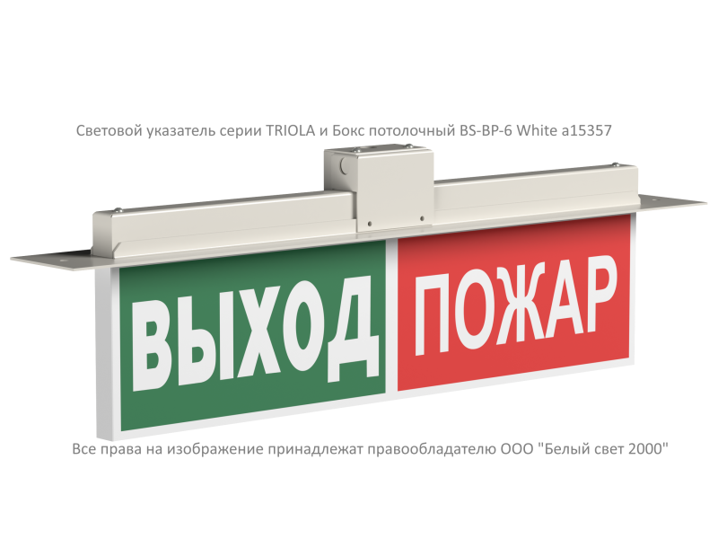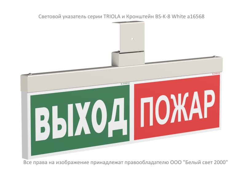 Световой указатель BS-TRIOLA-10-S1-24 имеет расстояние распознавания 20 метров. Динамический световой эвакуационный указатель позволяет указывать направление эвакуации в одну из двух сторон – это дает возможность интегрировать указатель в системы оповещения и управления эвакуацией (СОУЭ) 5 типа. Световой указатель имеет двустороннее размещение знаков безопасности.. Совместимая серия знака безопасности BL-2010B. Модель имеет централизованный режим работы, нормируемая продолжительности аварийной работы 0 ч. Номинальная потребляемая мощность 2,00 Вт. Класс защиты от поражения электрическим током: III Поддерживается тестирование и управление: Нет Материал корпуса сталь, порошковая эмаль Материал рассеивателя полиметилметакрилат Степень защиты от внешних воздействий IP44 Монтаж светового указателя производится на поверхность стен или потолков. На поверхность стен с помощью входящего в комплект кронштейна. Для монтажа в подвесные потолки типа «Армстронг» или в гипсокартон c помощью потолочного бокса BS-BP-6, в комплект поставки не входит.